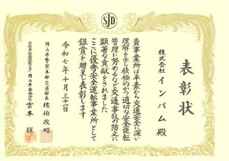 これは、岡山県警察本部および自動車安全運転センターより、日頃からの安全運転への取り組みと実績が評価され、表彰されたものです。